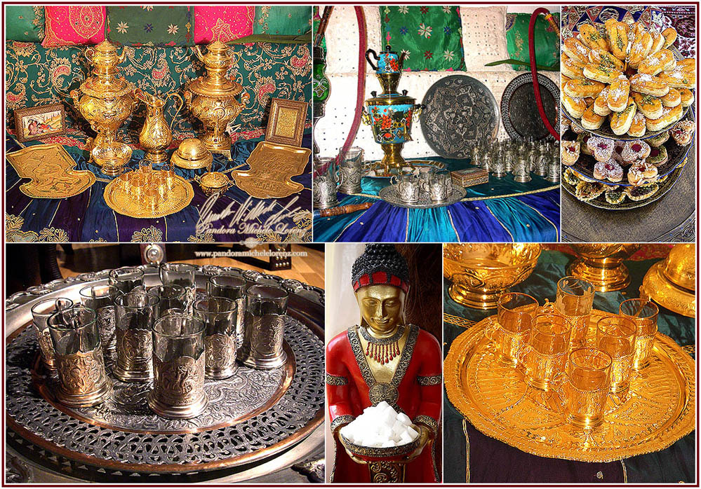 Samowar (siehe Bild) frisch zubereitet und z. B. auf orientalische